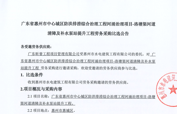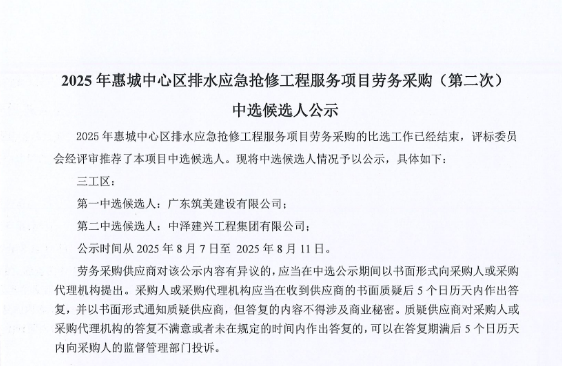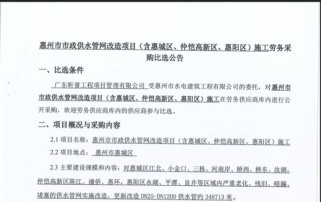 廣東省惠州市中心城區(qū)地下管網(wǎng)系統(tǒng)提升工程-內(nèi)街小巷排水管網(wǎng)病害修復及錯混接改造項目一期施工勞務(wù)采購比選公告……