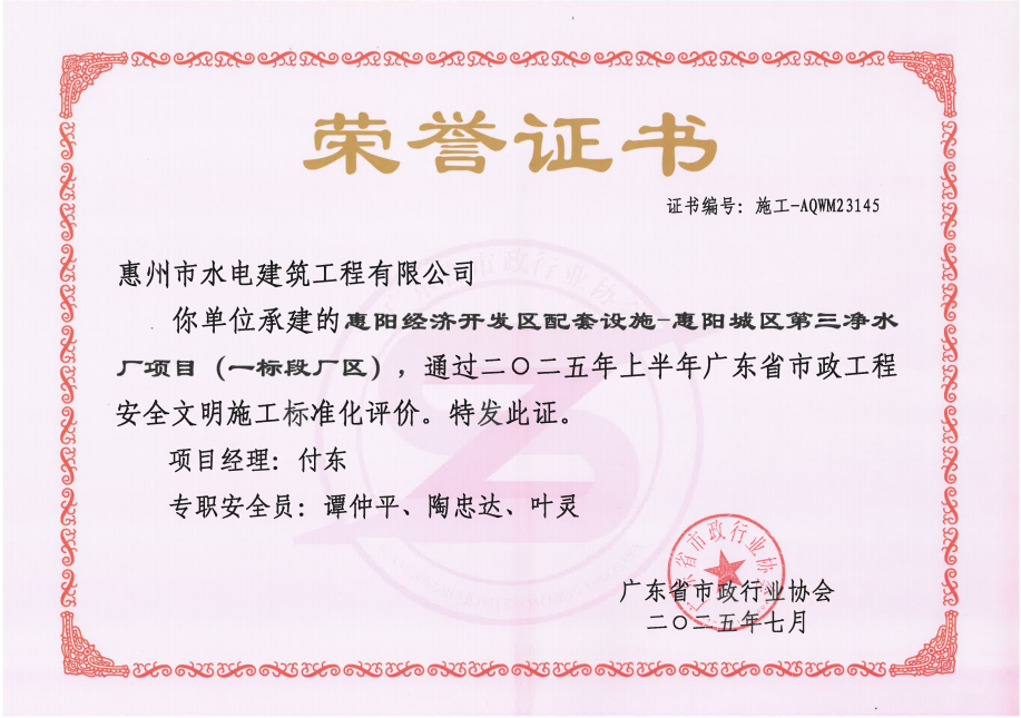 近日,廣東省市政行業(yè)協(xié)會傳來喜訊,由我司承建的惠陽經(jīng)濟開發(fā)區(qū)配套設(shè)施—惠陽城區(qū)第三凈水廠項目(一標段廠區(qū)),順利通過2025年上半年“廣東省市政工程安全文明施工標準化”評價。……